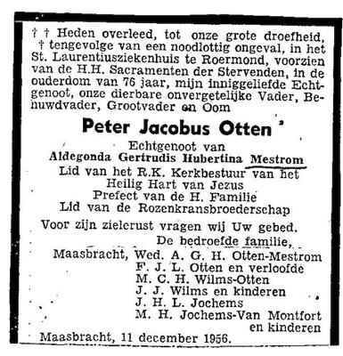 Afbeelding: 19561112 Overlijdensadvertentie Peter Jacobs Otten