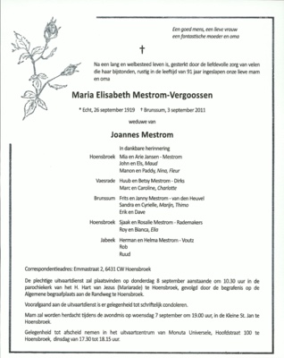 Overlijdensadvertentie Maria Elisabeth Mestrom-Vergoossen