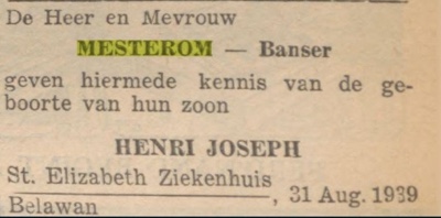 Geboorte advertentie Henry Joseph Mesterom